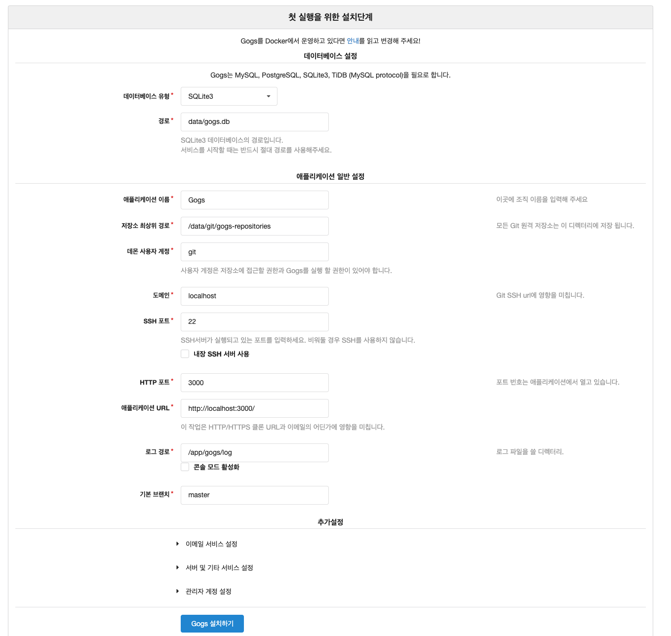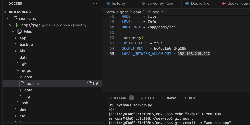 gogs webhook에서 local IP를 허용하도록 Gogs 컨테이너에 app.ini 파일을 수정합니다.