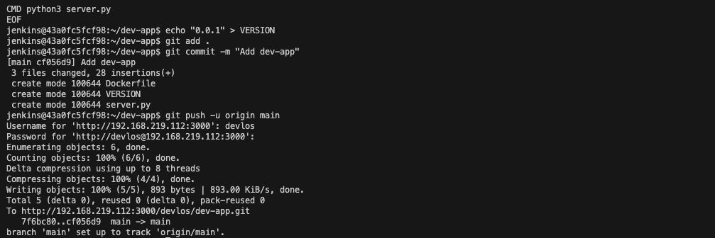 jenkins@5c1ba7016f9e:~/dev-app$ git add . && git commit -m "VERSION $(cat VERSION) Changed" && git push -u origin main