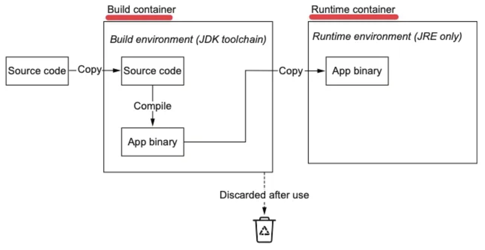 앞서 보았던 docker 내부에서 빌드하는 방식은 로컬 환경에서 빌드를 하지 않아도 되기 때문에 편리하지만, 컨테이너 탈취 시 코드정보를 모두 노출시킬 수 있는 문제가 있습니다.