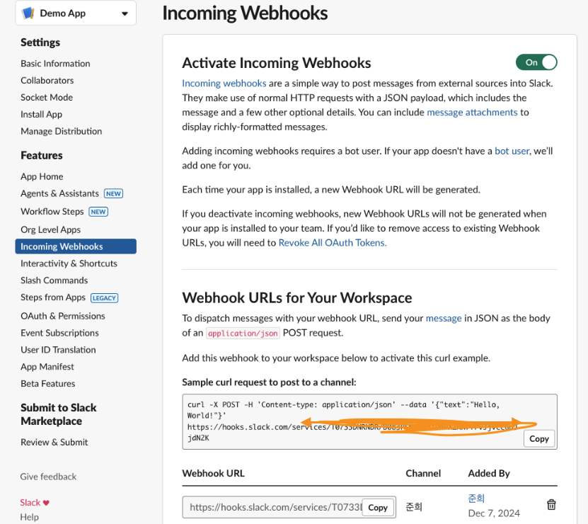 다음으로 slack 연동을 위한 webhooks을 등록해 줍니다.