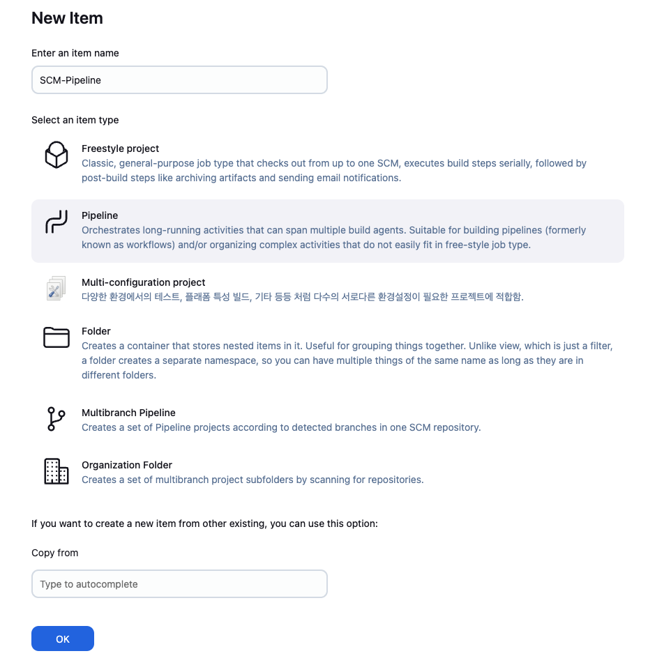 이제 SCM 기반 파이프라인을 구성하기 위한 SCM-Pipeline 세팅을 합니다.