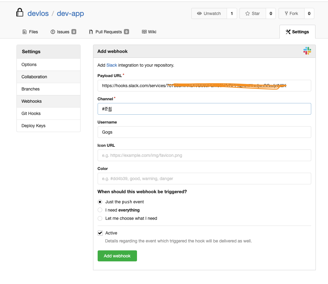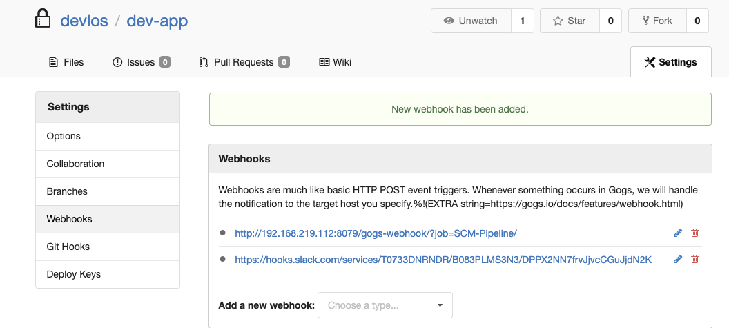 정상적으로 등록이 되면 다음과 같이 webhook 리스트에 gogs가 표시됩니다.