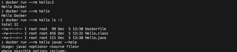 docker run --rm hello javac --help