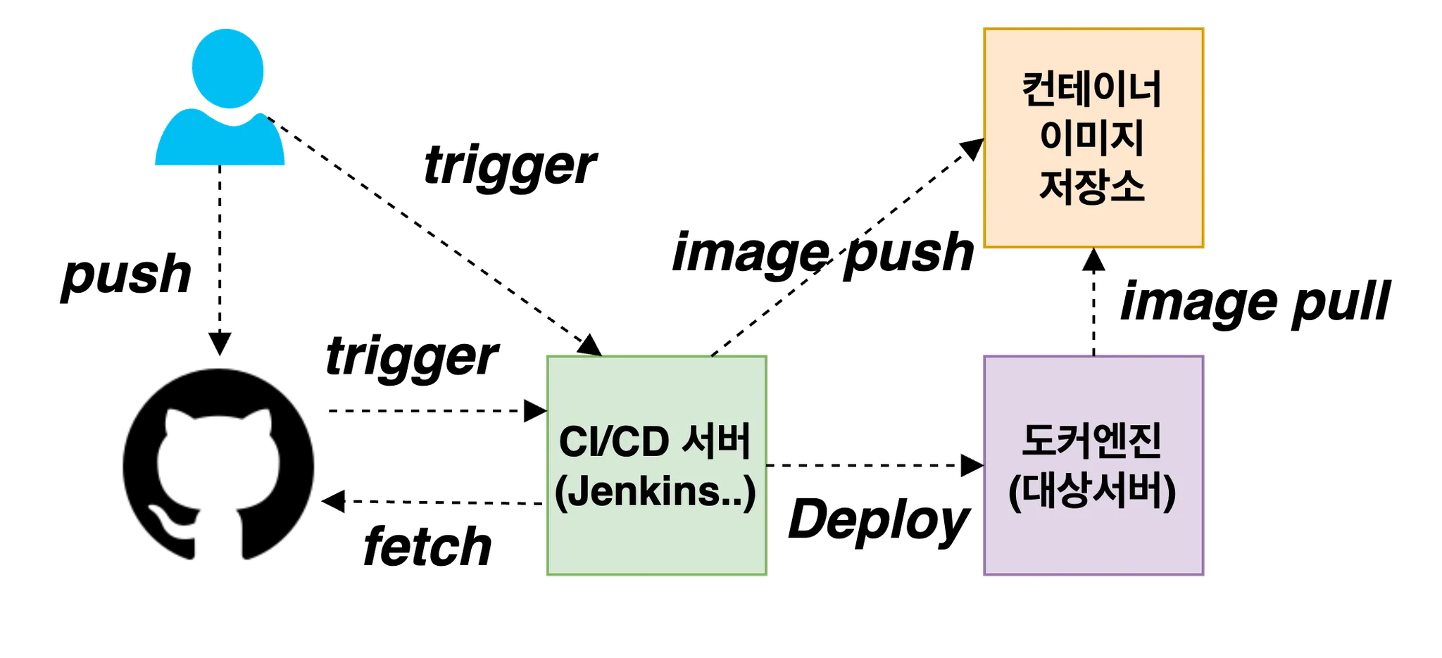 - 사용자가 Git 저장소에 코드를 푸시하면, CI/CD 서버가 이를 감지하고 작업을 트리거합니다.