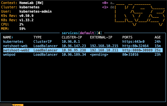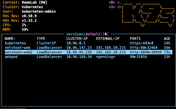 netshoot-web LoadBalancer 10.96.64.29 192.168.10.215 80:30131/TCP 14m