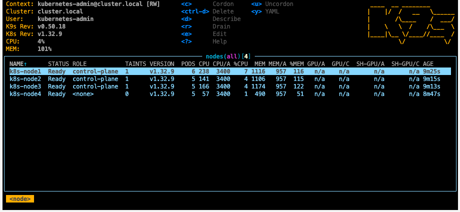 # k8s-node1 Ready control-plane 3h51m v1.34.3 192.168.10.11 <none> Rocky Linux 10.0 (Red Quartz) 6.12.0-55.39.1.el10_0.aarch64 containerd://2.2.1