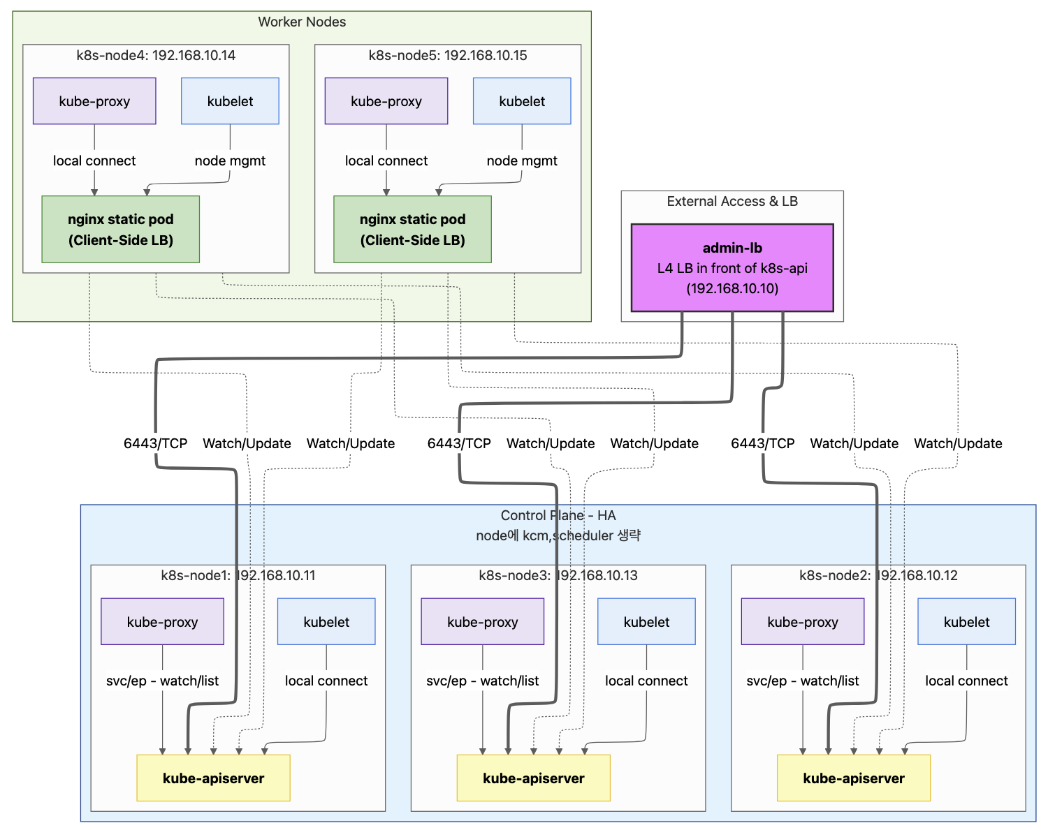 워커 노드(k8s-node4, node5, 192.168.10.14~15)에는 Client-Side LB가 배치됩니다. 이 실습에서는 노드마다 nginx static pod가 그 역할을 하며, 노드 내에서 kubelet과 kube-proxy가 이 로컬 LB(nginx)로 연결하고, nginx가 백엔드 3대의 kube-apiserver로 분산 연결합니다.