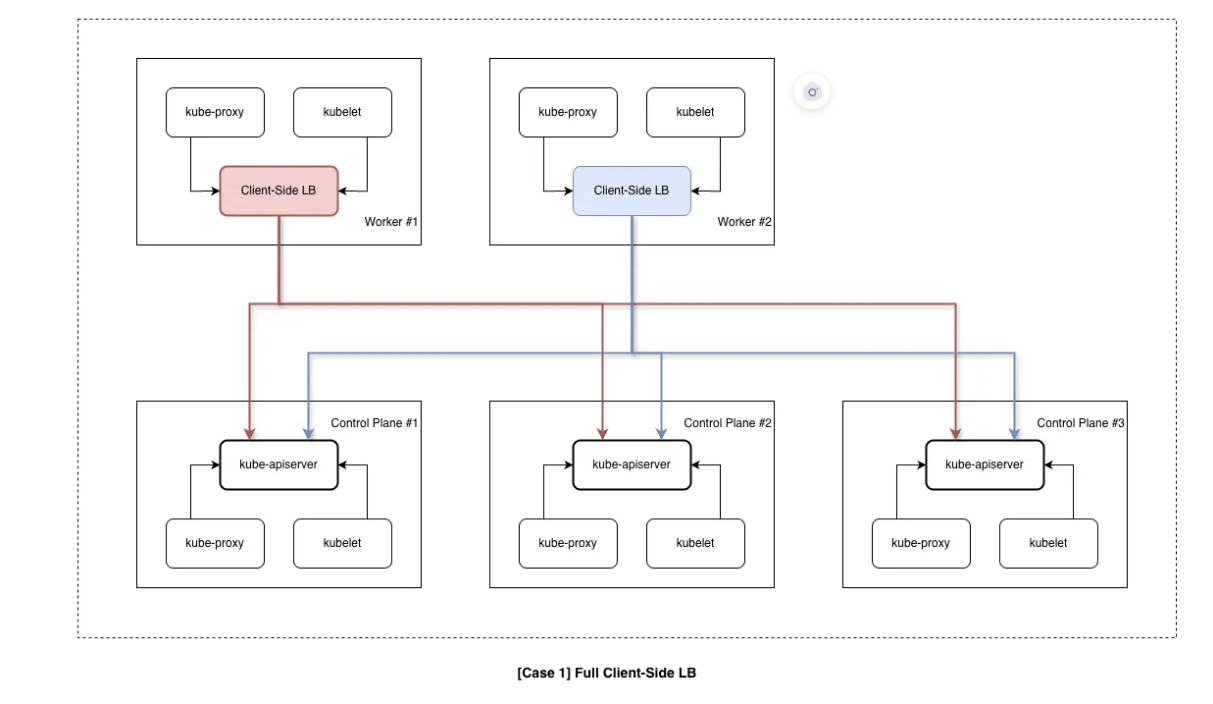 즉 워커는 로컬 LB 한 곳만 바라보고, 그 LB가 컨트롤 플레인 3대와 통신하는 구조입니다. 사용자 트래픽은 앞단 L4 LB(HAProxy)로, 워커 트래픽은 노드별 Client-Side LB(nginx)로 각각 고가용·부하 분산됩니다.
