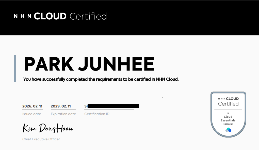 교육 수강 이후에는 NHN Cloud CES (Cloud Essentials) 자격증도 취득했습니다 😀