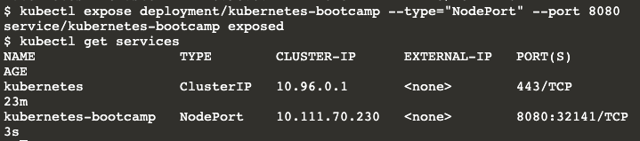 $ kubectl expose deployment/kubernetes-bootcamp --type="NodePort" --port 8080