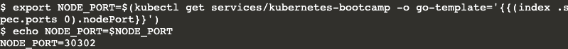 $ export NODE_PORT=$(kubectl get services/kubernetes-bootcamp -o go-template='{{(index .spec.ports 0).nodePort}}')