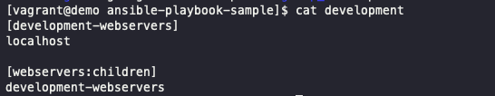 위와 같이 ansible-playbook-sample 폴더 구성요소를 살펴 보면 development라는 파일이있고, 이 파일은 아래와 같이 webservers에 localhost라는 정보를 저장하고 있다.