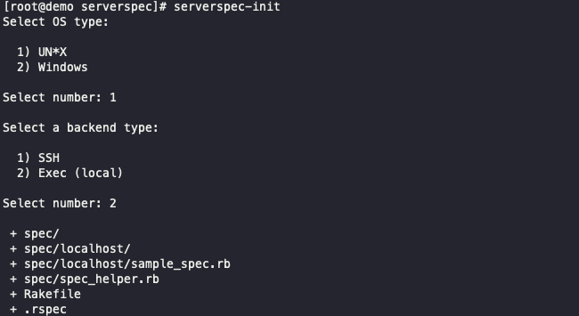 다음으로 serverspec-init 명령어를 실행한 후 1, 2 옵션을 차례로 선택한다.