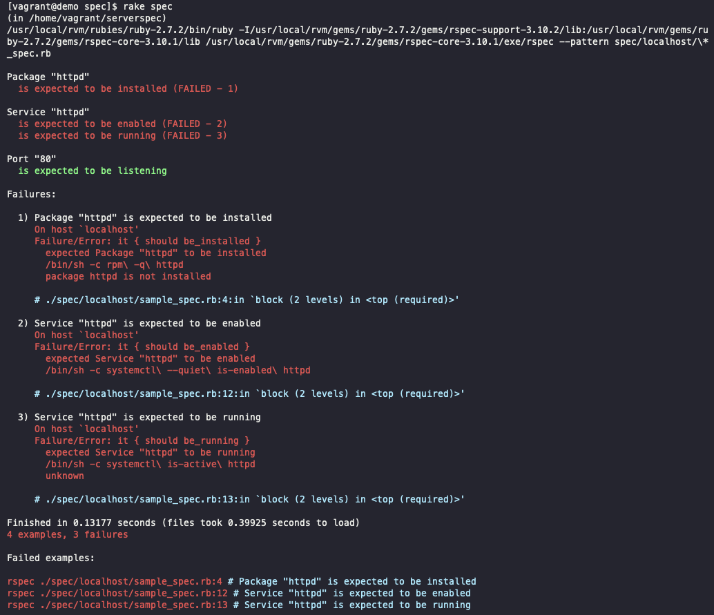 About V2 Serverspec/Specinfra v2 has been just released. See the document about v2. About With Serverspec, you can write RSpec tests for checking your servers are configured correctly. Serverspec tests your servers’ actual state by executing command loca