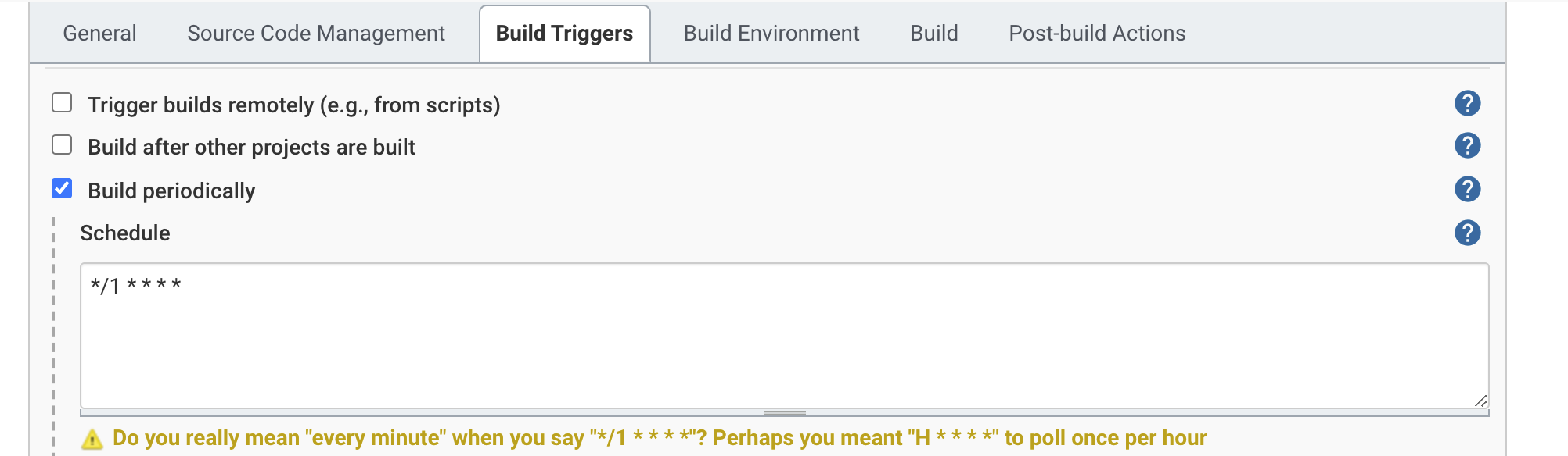 만약 빌드를 주기적으로 실행하고 싶을 경우, 옵션에서 buld periodically를 선택하고, cron 표현식을 이용하여 정기적으로 실행하게 할 수 있다.