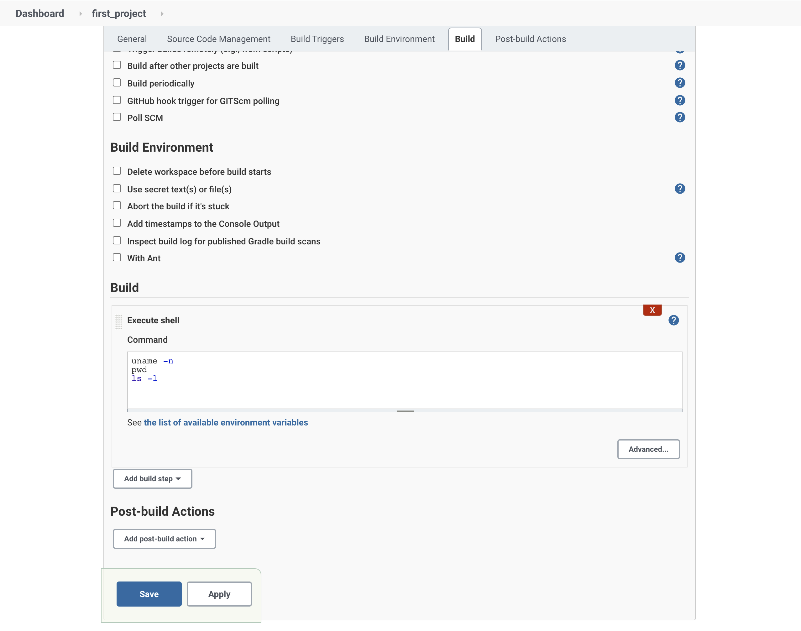 Execute shell에 다음처럼 명령어를 작성한다.