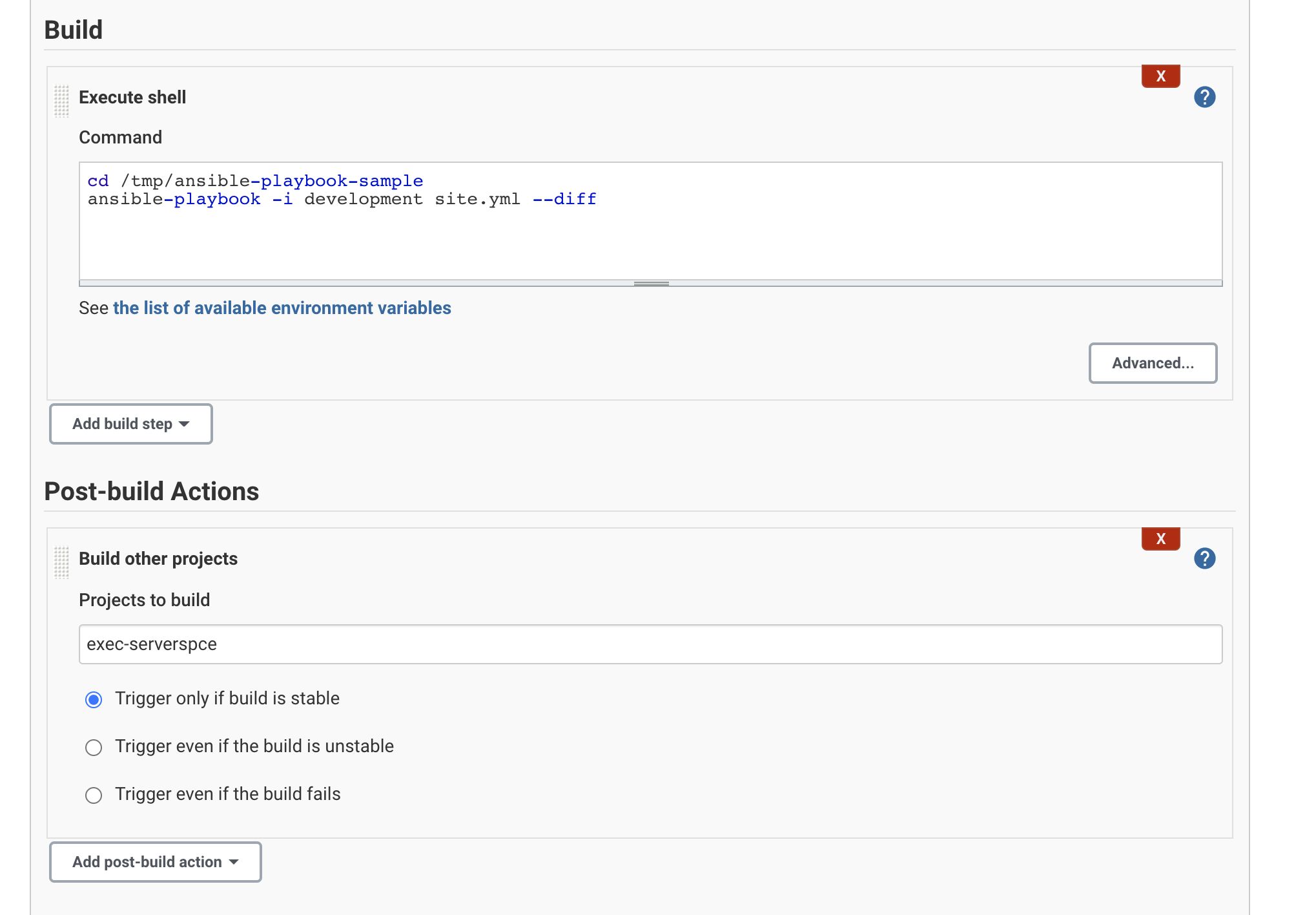 2.1. 단계에서 만든 "exec-ansible"의 설정에서 "Post-build Actions" 부분에 "Build other project"를 선택하고, exec-serverspec을 입력한다. 그리고 선택은 Trigger only if build is stable을 선택한 후 저장한다.
