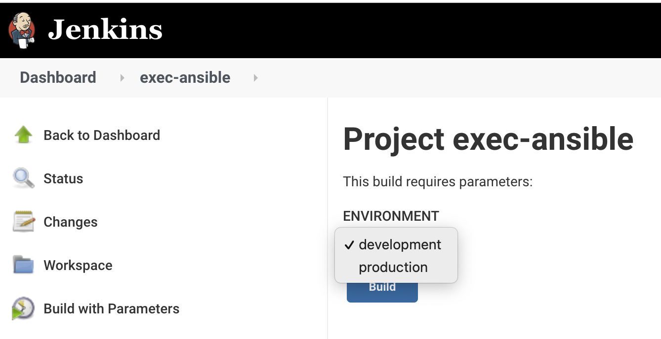 Dasnboard에서 exec-ansible 프로젝트를 선택하고 옵션에서 "This project is parameterized"를 선택한다.