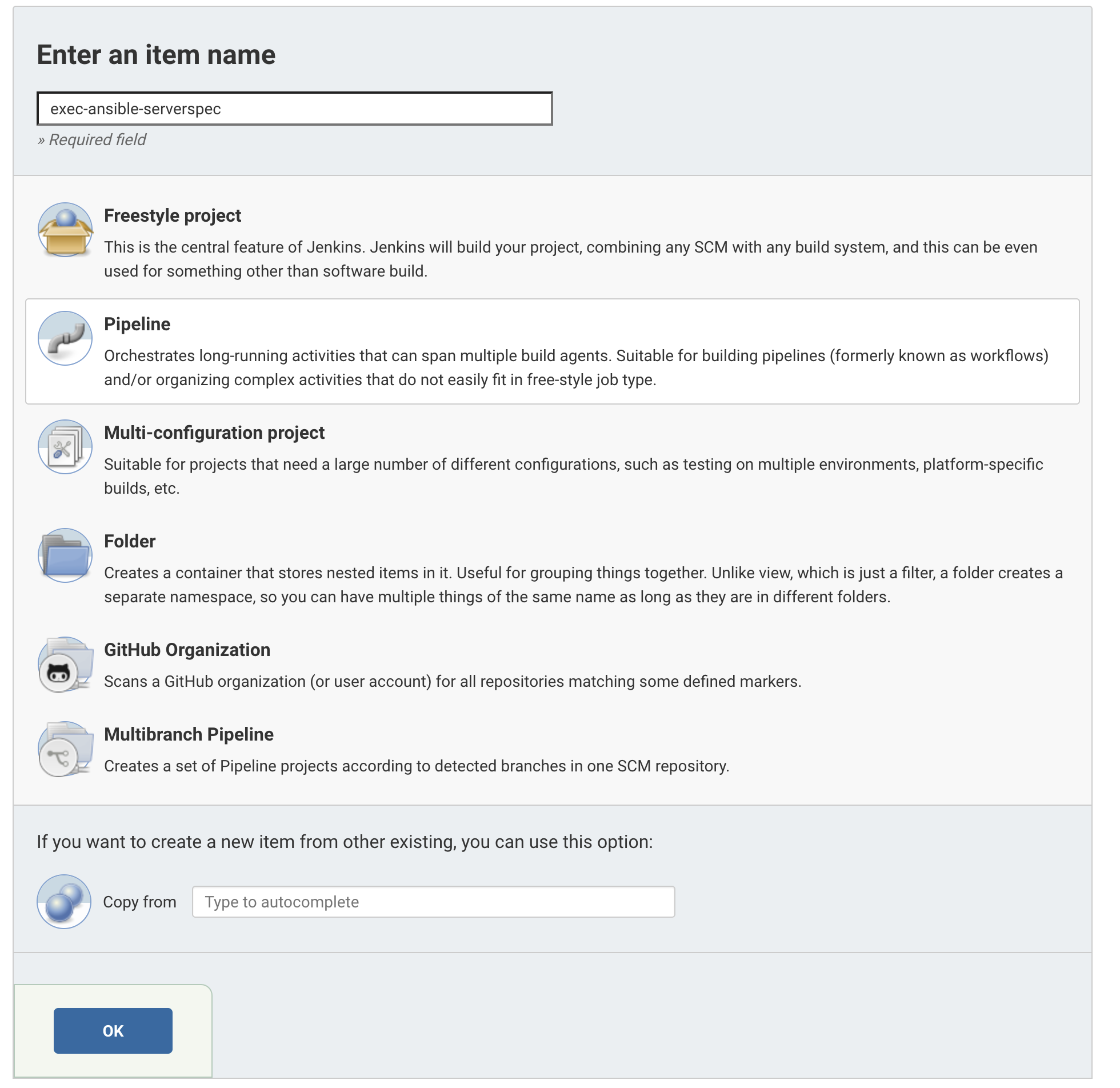 "exec-ansible-serverspec"이라는 프로젝트를 생성한다. 이때 프로젝트 타입은 Pipeline을 선택한다.