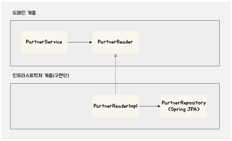 도메인 계층의 입장에서 이런 식으로 구현을 하게 되면 인프라 스트럭처 계층의 변화에 따라서 도메인 계층의 구현이 영향을 받게 된다. 그래서 DIP(의존성 역전)를 이용하여 도메인 계층에서 정의한 인터페이스를 인프라스트럭처에서 구현 하는 식으로 설계한다.
