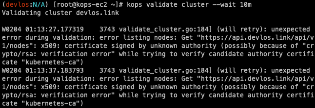 클러스터 생성 시 아래와 같은 오류로 인해 클러스터 접근 자격증명 문제가 발생했다. 3시간 정도 스택 삭제 생성을 반복하고 9~10분 정도 기다려봐도 동일한 증상이 발생했다.