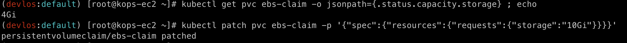 ebs를 이용한 PV의 볼륨은 Pod를 재구동 하지 않고도 용량을 늘릴 수 있다. 명령어를 통해서 용량을 증가시킬 수 있지만, 줄일 수는 없다고 한다.