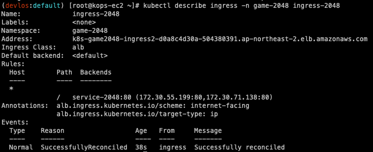 Ingress 구성을 좀 더 살펴보면 다음과 같이 alb Ingress Class를 사용하고, 위에서 설정한 Annotation이 잘 적용된 것을 확인할 수 있다.