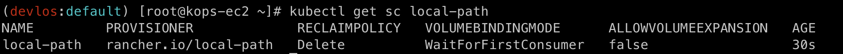 실습 시 storage class는 다음과 같이 local path provisioner를 사용했다.