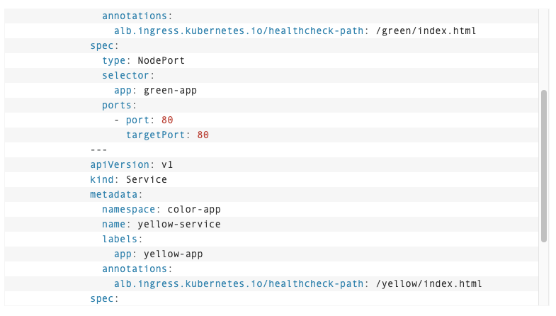 Pod는 생략하고 Service와 Ingress의 설정을 살펴보도록 한다. services는 80 -> 80 Port로 동작하게끔 되어있고 NodePort타입을 사용하고 있다.