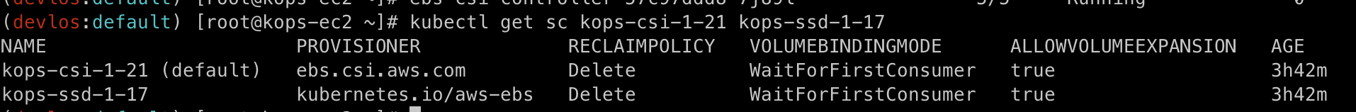 기본적으로 배포되어 있는 ebs 중에서도 default로 되어 있는 것이 gp3 볼륨이다. 별다른 설정 없이는 PVC 생성 시 기본으로 kops-cso-1-21 storage class를 사용한다.