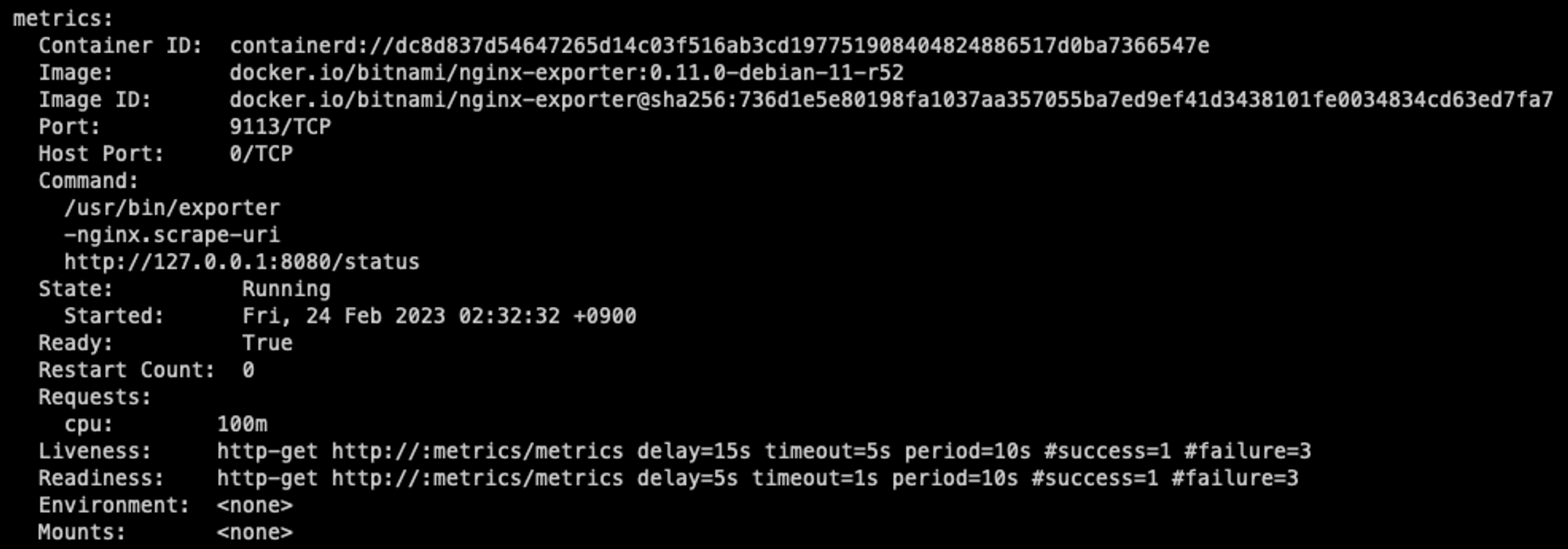 nginx를 배포한 후 Pod의 컨테이너를 확인해 보면 다음과 같이 metrics 관련 컨테이너가 함께 생성되었음을 확인할 수 있다.