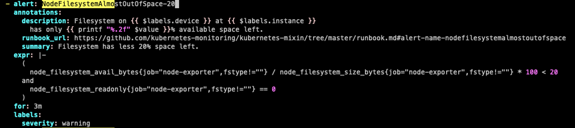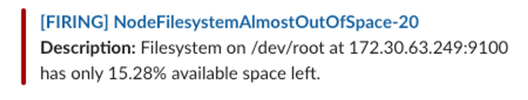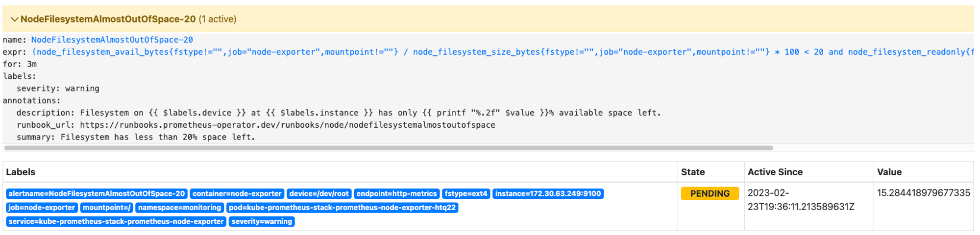 기존 파일 시스템은 여유공간이 5% 미만일 때 경고를 발생시키지만 설정을 통해 80% 이상이면 시스템 경고를 발생시키도록 alert rule을 생성한다.
