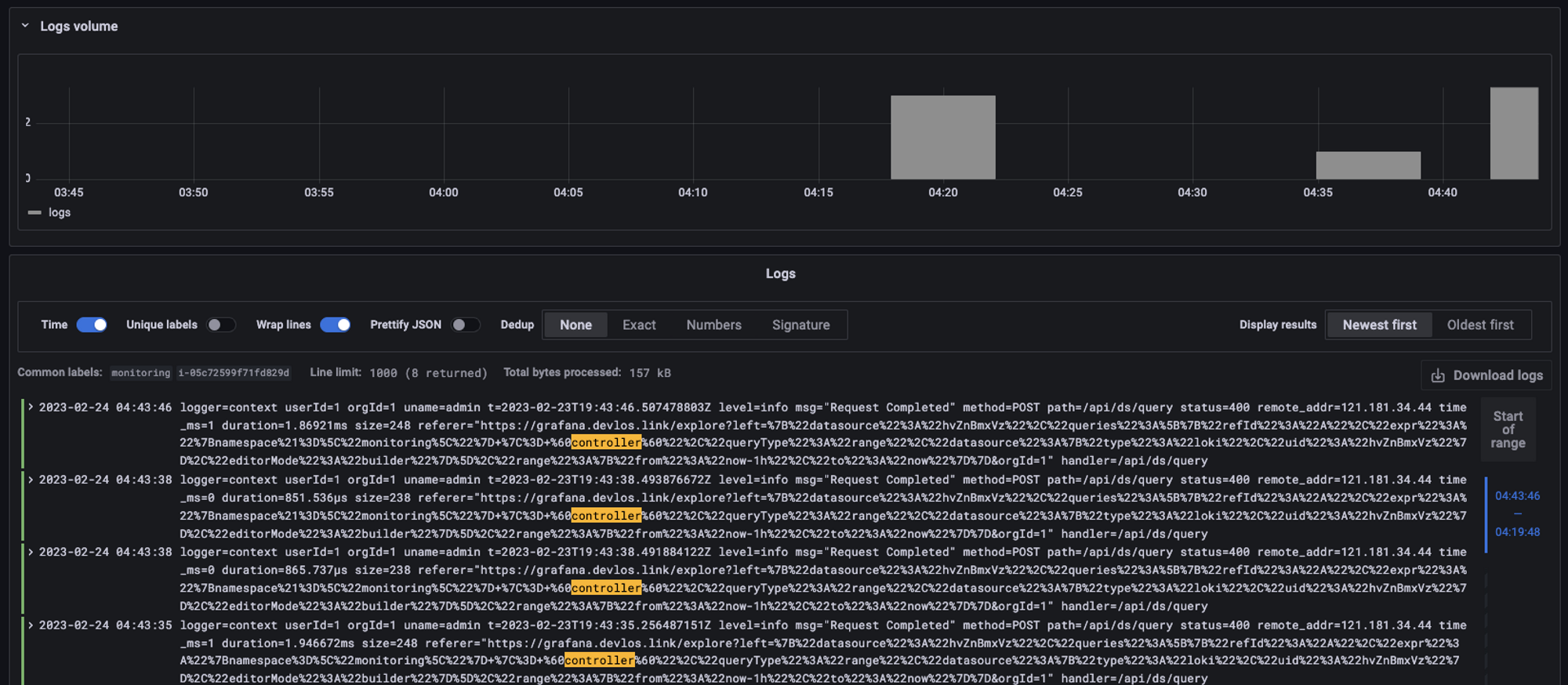 kubernetes namespace 로그에서 controller 키워드가 포함된 로그 출력하기
