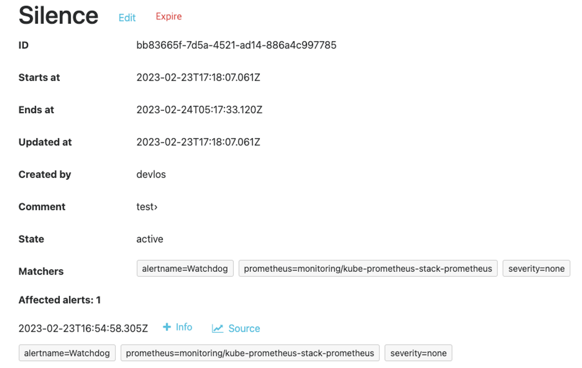 Alertmanager > Silences에서 사용 가능하다.