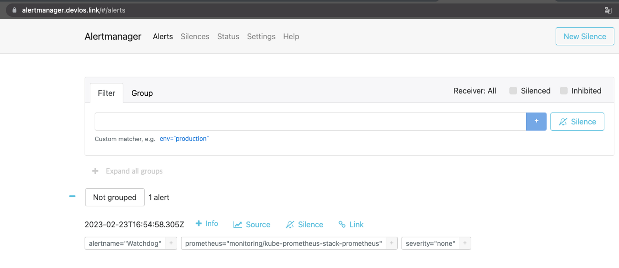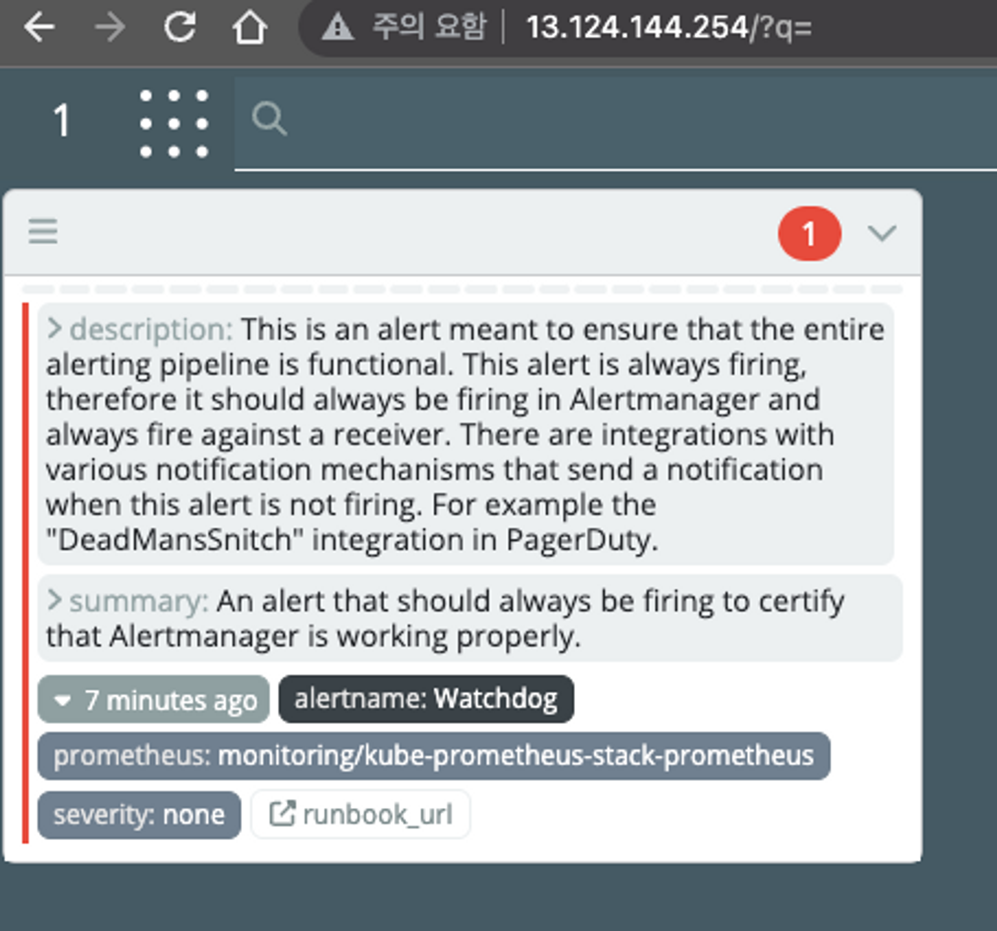 Alert Manager를 설치하고 접속하면 다음과 같은 화면을 볼 수 있다. 화면은 Alertmanager의 진입 페이지인데, watchdog으로 부터 알림 하나가 와있음을 확인할 수 있다. 이 watchdog는 Alert 을 전달하는 Prometheus가 정상적으로 동작하고 있는지 확인하기 위한 용도이다.