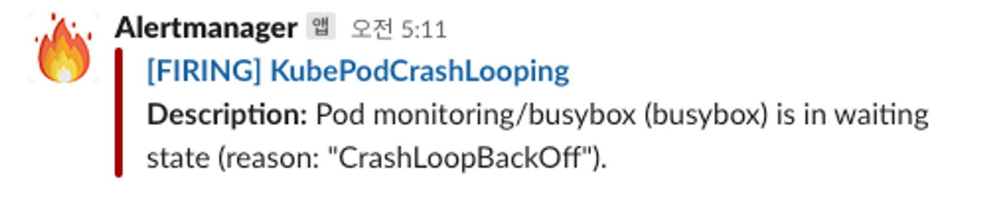 Slack의 웹훅 주소를 alertmanager-kube-prometheus-stack-alertmanager 파드에 환경설정으로 추가하면 다음과 같이 Alert이 Slack의 특정 채널에 연동된다.