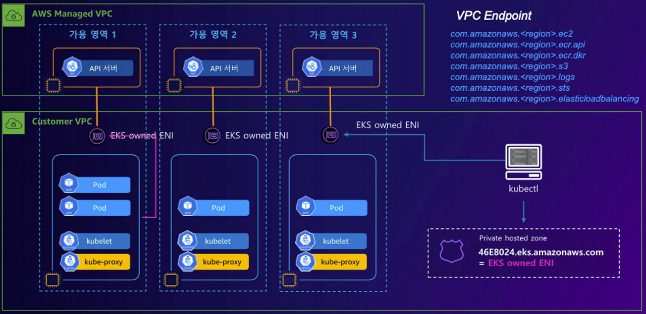 EKS Cluster의 Endpoint에 접근하는 방법에 대한 내용 역시 설명을 들었는데, AWS Managed VPC와 Customer VPC를 Public환경과 Private 환경으로 구축하여 API 서버와 Kubelet과의 통신, 그리고 Kube-proxy의 외부 통신, 개발자의 클러스터 접근하는 방법을 제한할 수 있는 다양한 방법이 있었다.