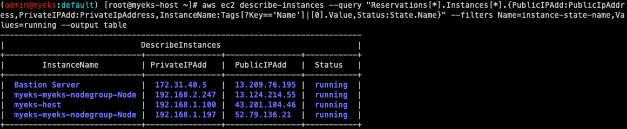 aws ec2 describe-instances --query "Reservations[*].Instances[*].{PublicIPAdd:PublicIpAddress,PrivateIPAdd:PrivateIpAddress,InstanceName:Tags[?Key=='Name']|[0].Value,Status:State.Name}" --filters Name=instance-state-name,Values=running --output table
