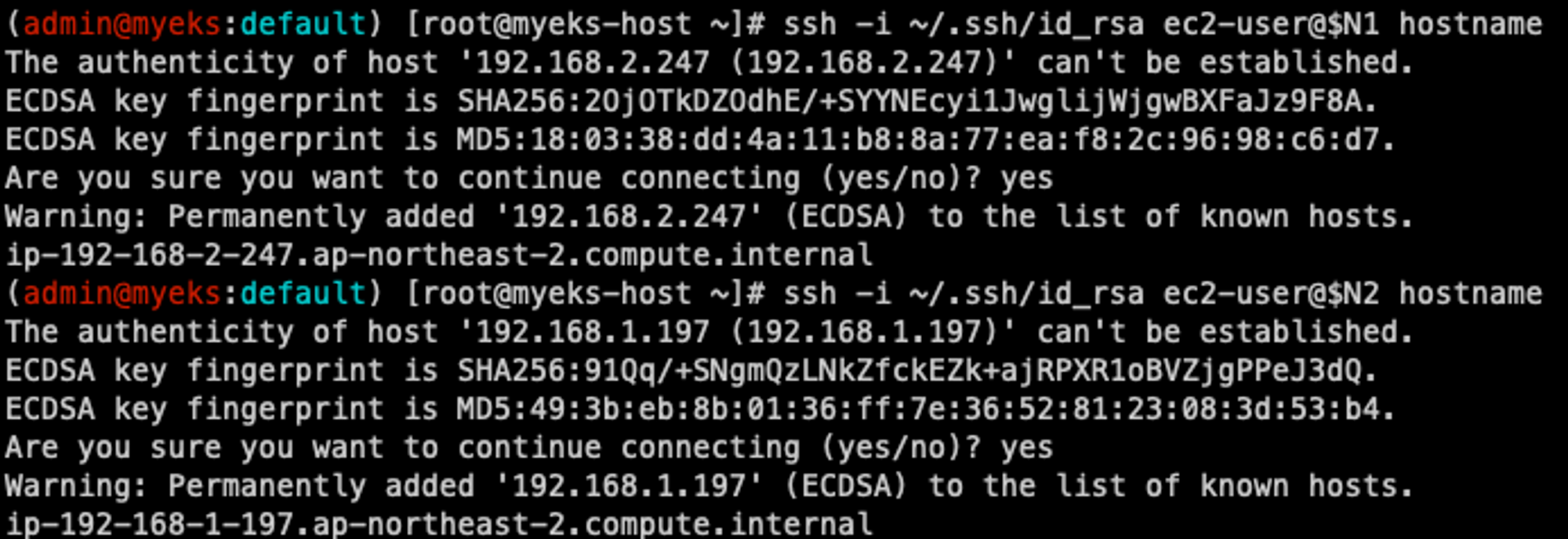 세팅을 끝내고 hostname을 조회해보면 Bastion에서 각 데이터 플레인 노드에 접속 가능해진다.