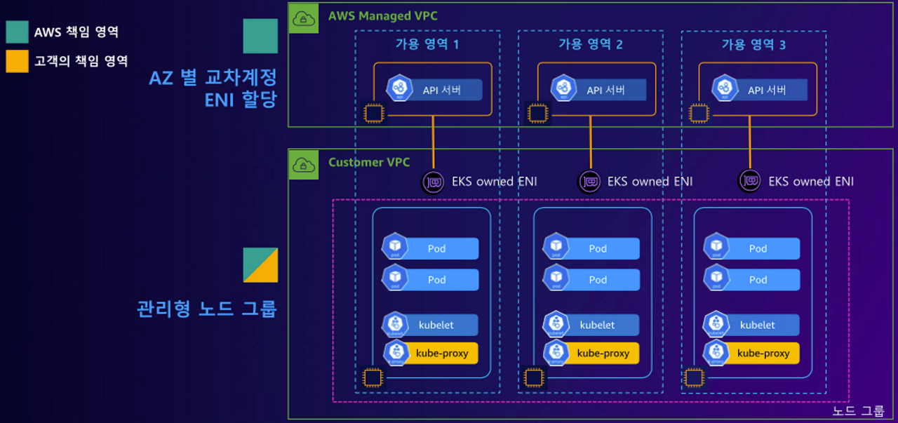 Customer VPC는 사용자가 직접 생성하고 관리하는 VPC로 관리형 노드 그룹(EC2)이 배치된다. VPC가 분리되어 있기 때문에 통신을 위해 EKS owned ENI(Elastic Network Interface)를 사용한다. EKS owned ENI는 클러스터 생성 시 자동으로 생성되며, VPC의 서브넷에 할당되어 각 노드의 kubelet과 통신할 수 있도록 한다.
