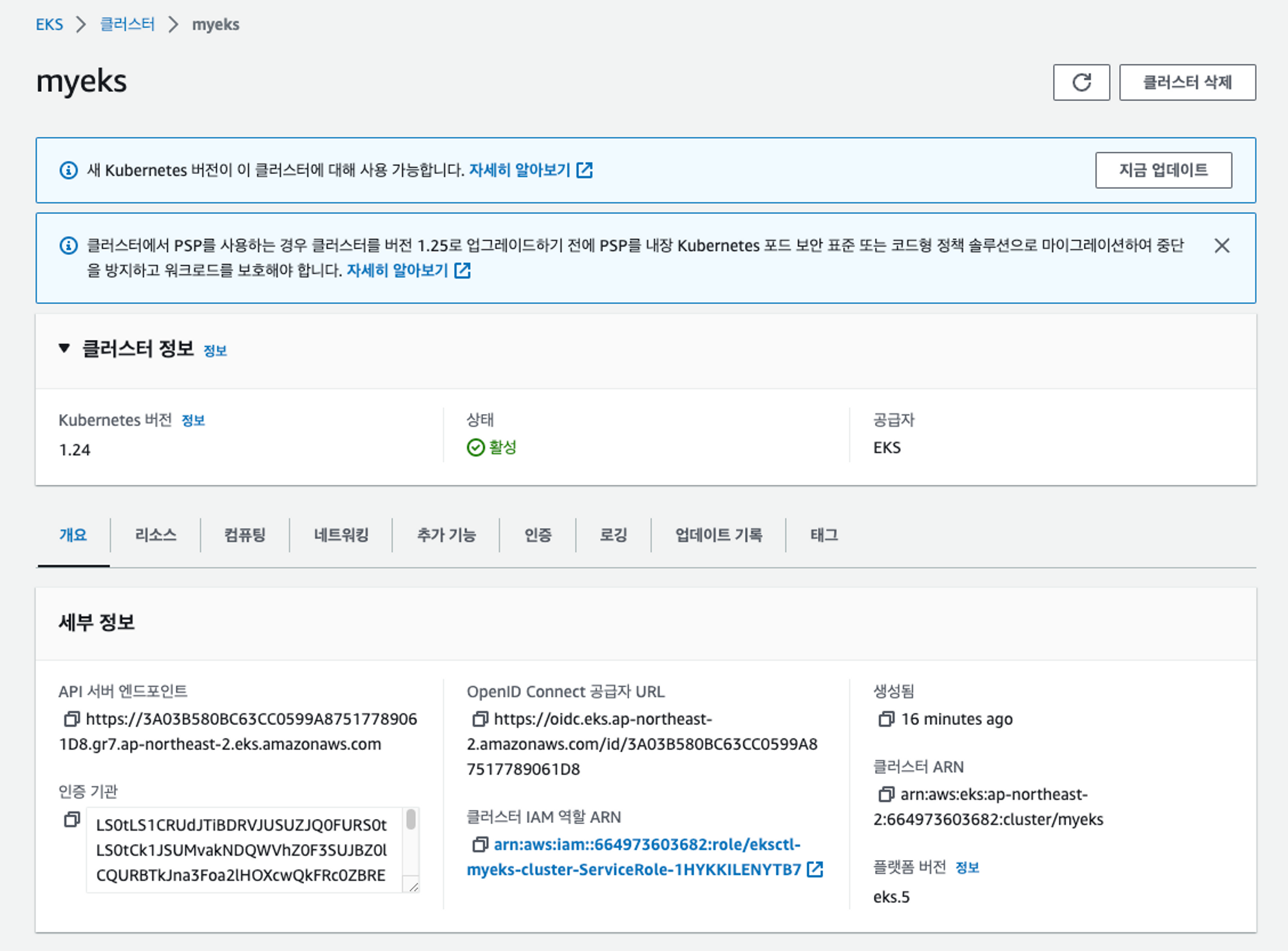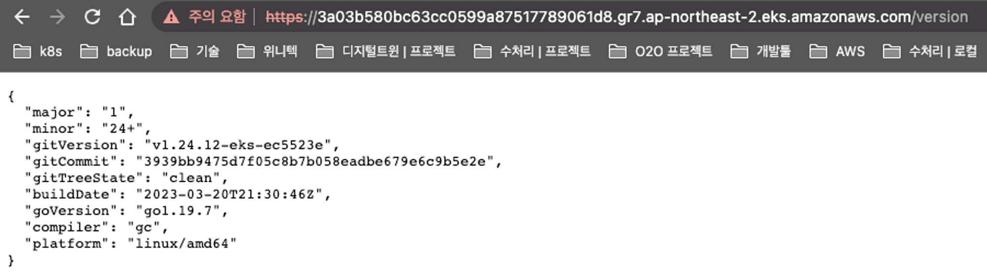 실습 환경을 통해 쿠버네티스를 구축하면 Kubernetes 1.24버전이 설치되고, t3.medium 2대로 구성된 데이터 플레인이 생성되었다. 이때 API 서버 엔드포인트는 Public으로 구성되어서 아래와 같이 외부에서 접근가능해진다.