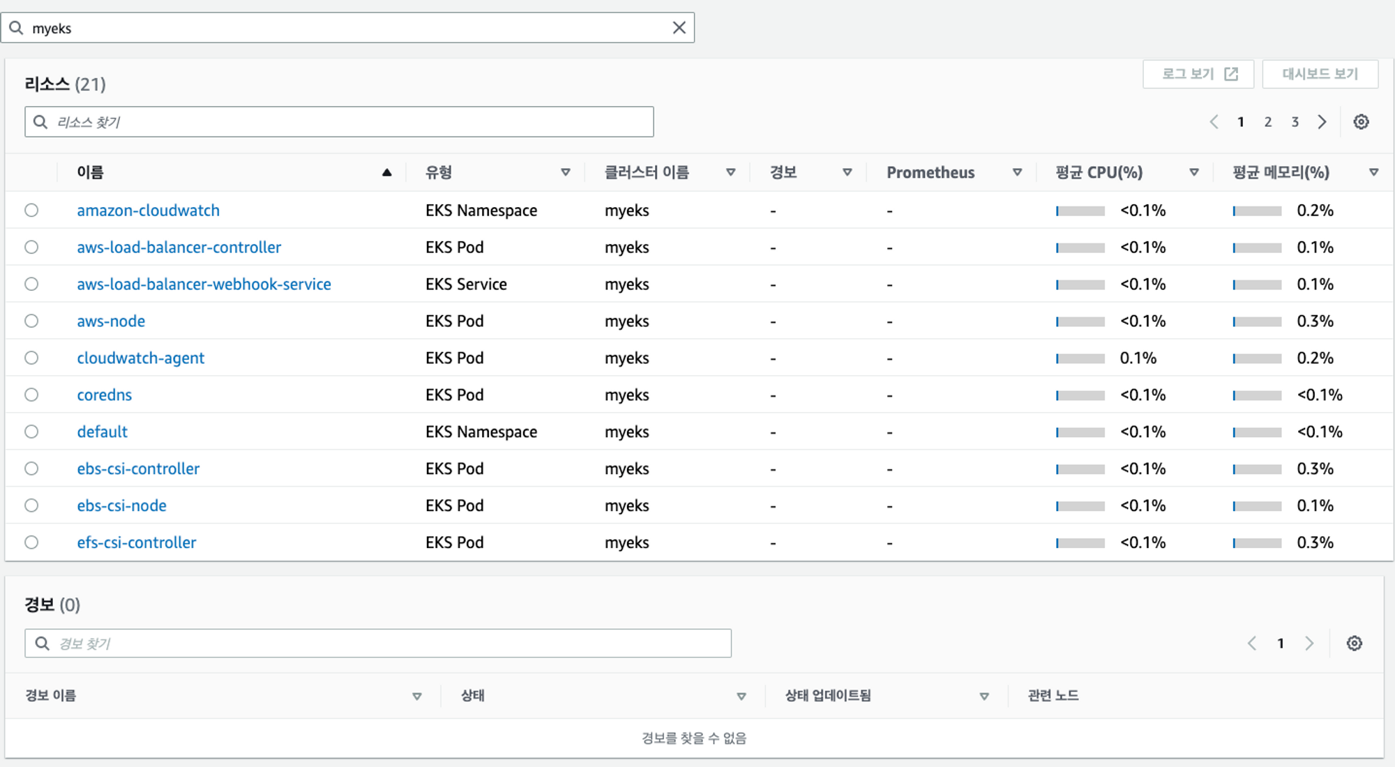이번 글에서는 EKS Observability에 관한 세미나 내용과 실습한 내용에 대해서 정리했다. Kubernetes 클러스터의 로깅과 모니터링 환경을 helm을 통해 설치하는 것이 이전 스터디보다 훨씬 익숙하게 느껴진다. 그리고 EKS 콘솔을 이용한 리소스 모니터링도 간단한 정보를 확인하기 좋은 것 같았다.