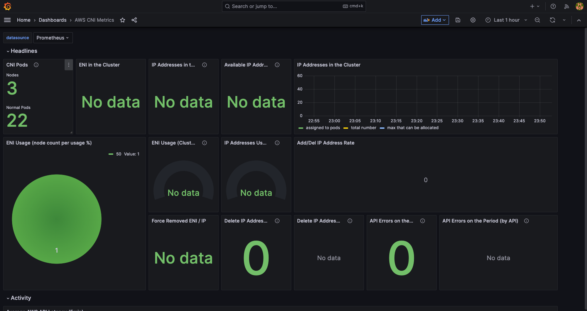 AWS CNI Metrics을 확인할 수 있는 Amazon EKS 대시보드는 아래와 같이 Pod Monitor를 배포하면 사용할 수 있다.