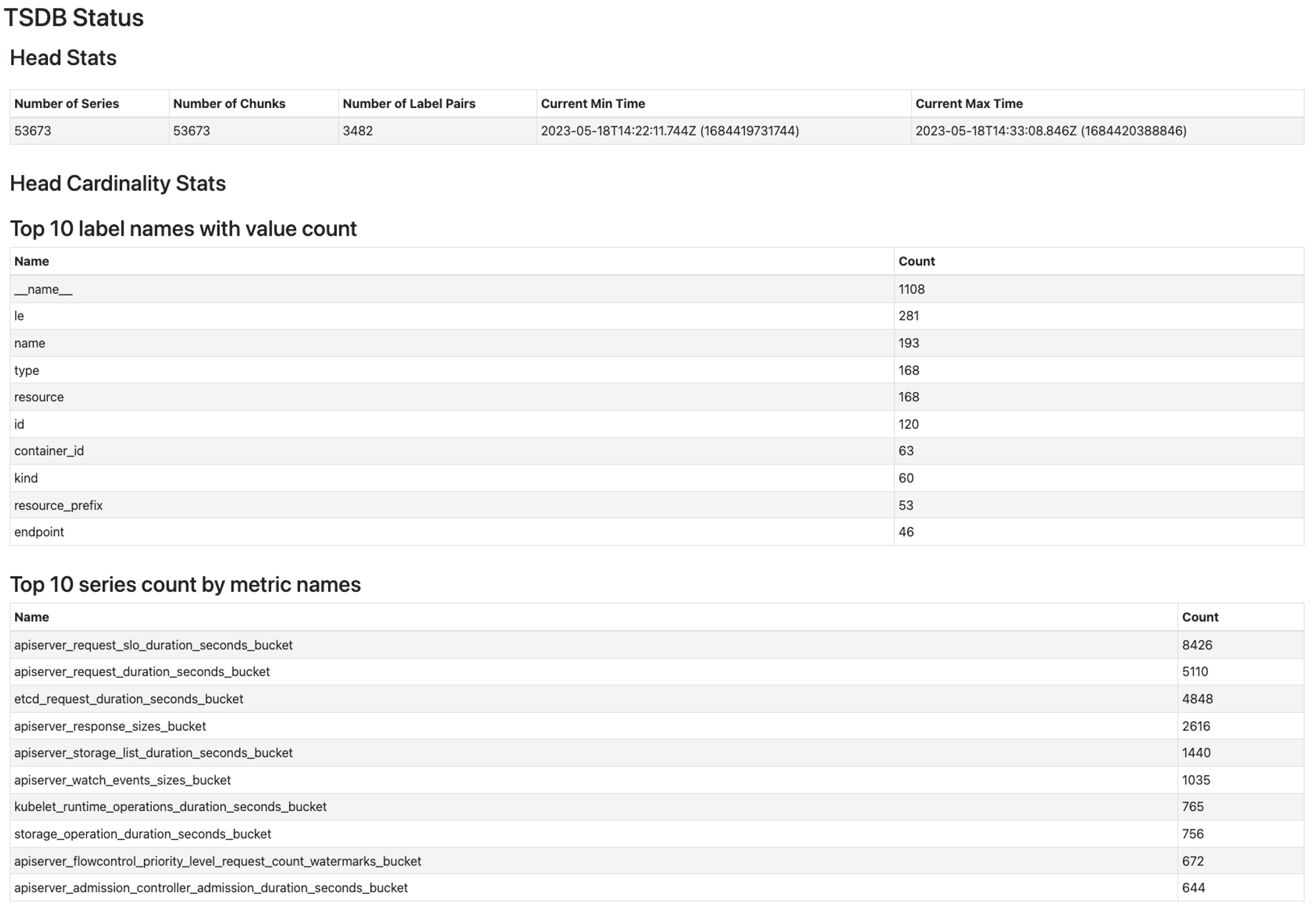 먼저 TSDB의 상태를 확인해 본다. TSDB에 저장된 매트릭 개수와 같은 것들을 확인할 수 있다.