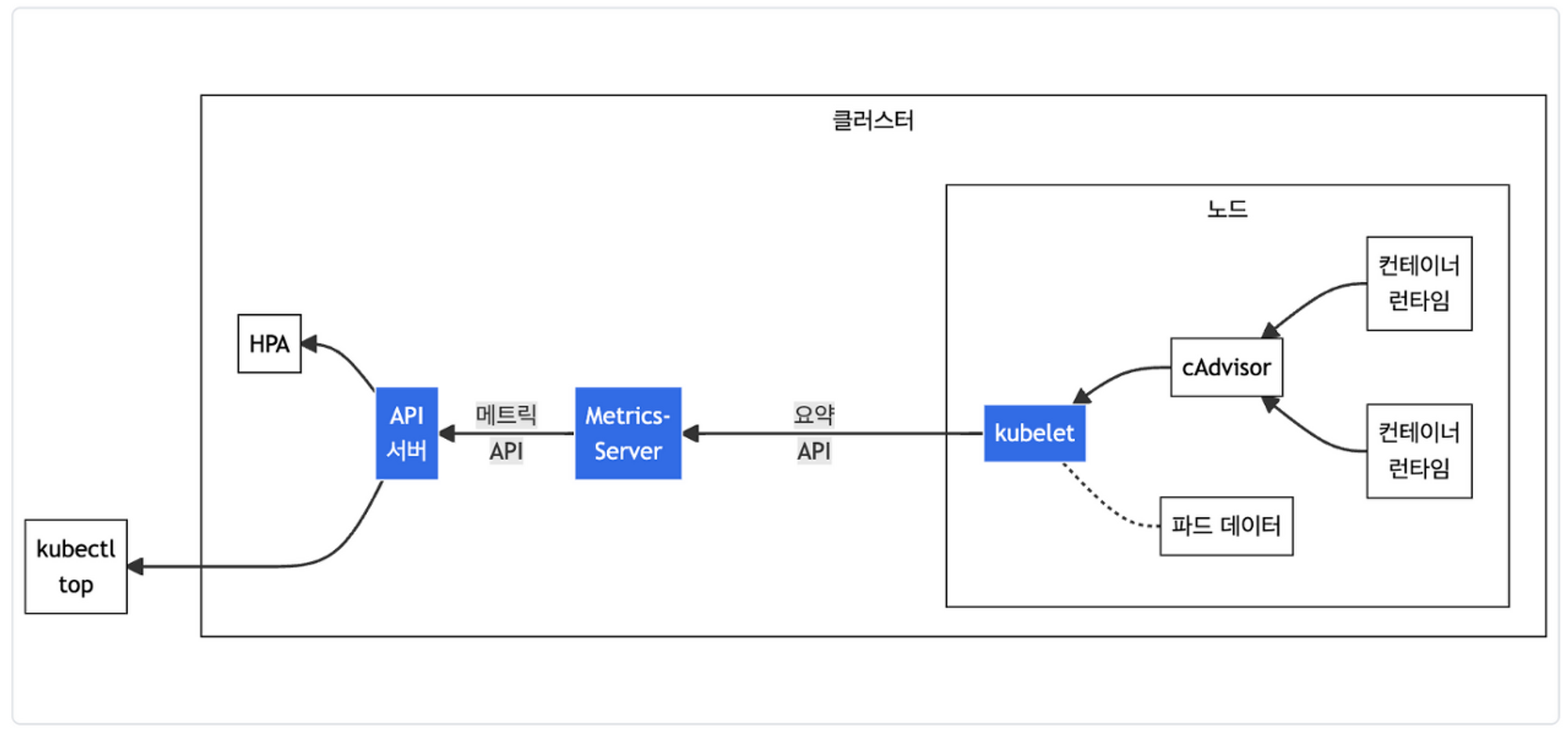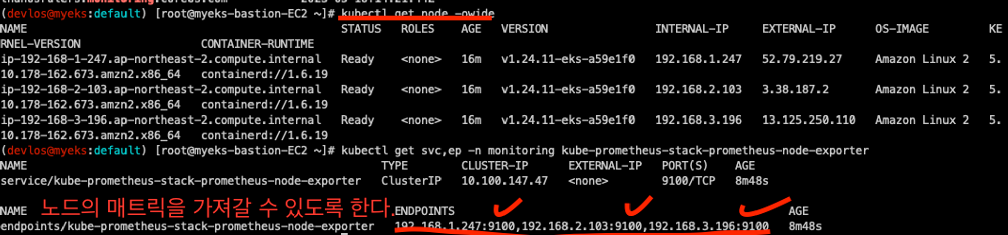 - Prometheus: 쿠버네티스 및 노드의 메트릭을 수집하여 저장하는 역할