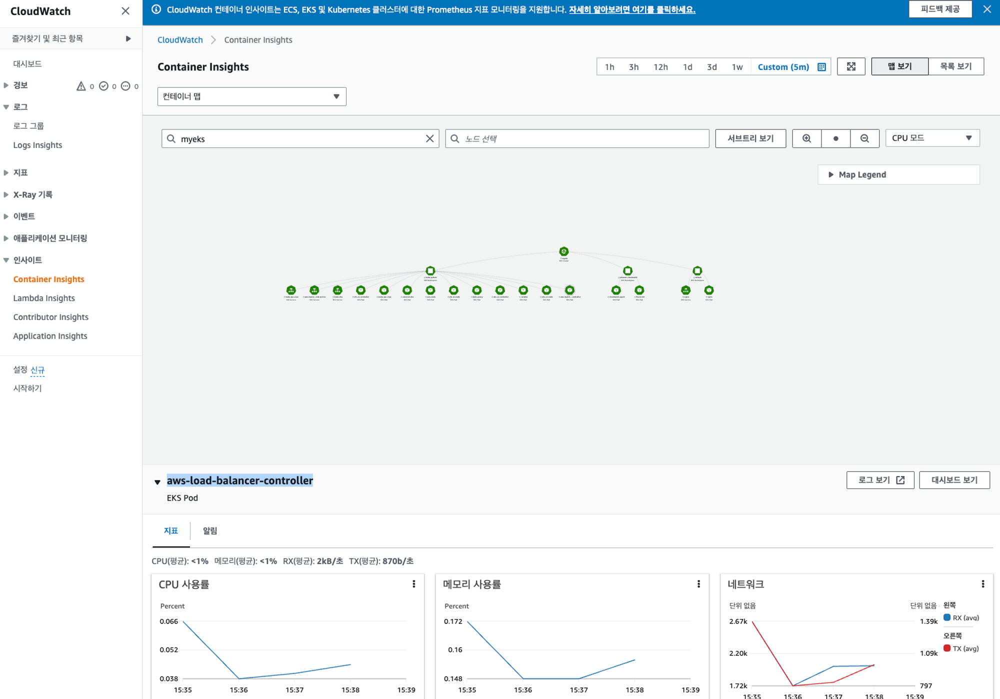 노드마다 CloudWatch Agent 파드와 Fluent Bit 파드가 데몬 셋으로 배치되어 Metrics과 Log를 수집할 수 있다.