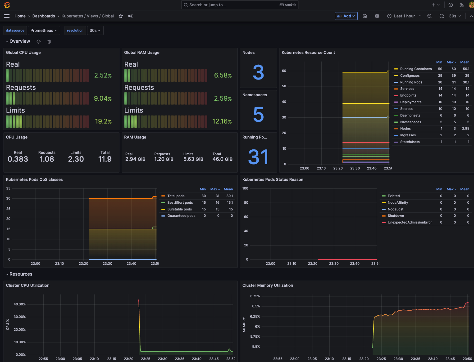 전체 CPU 사용량, 노드, 네임스페이스 수 등을 확인할 수 있음