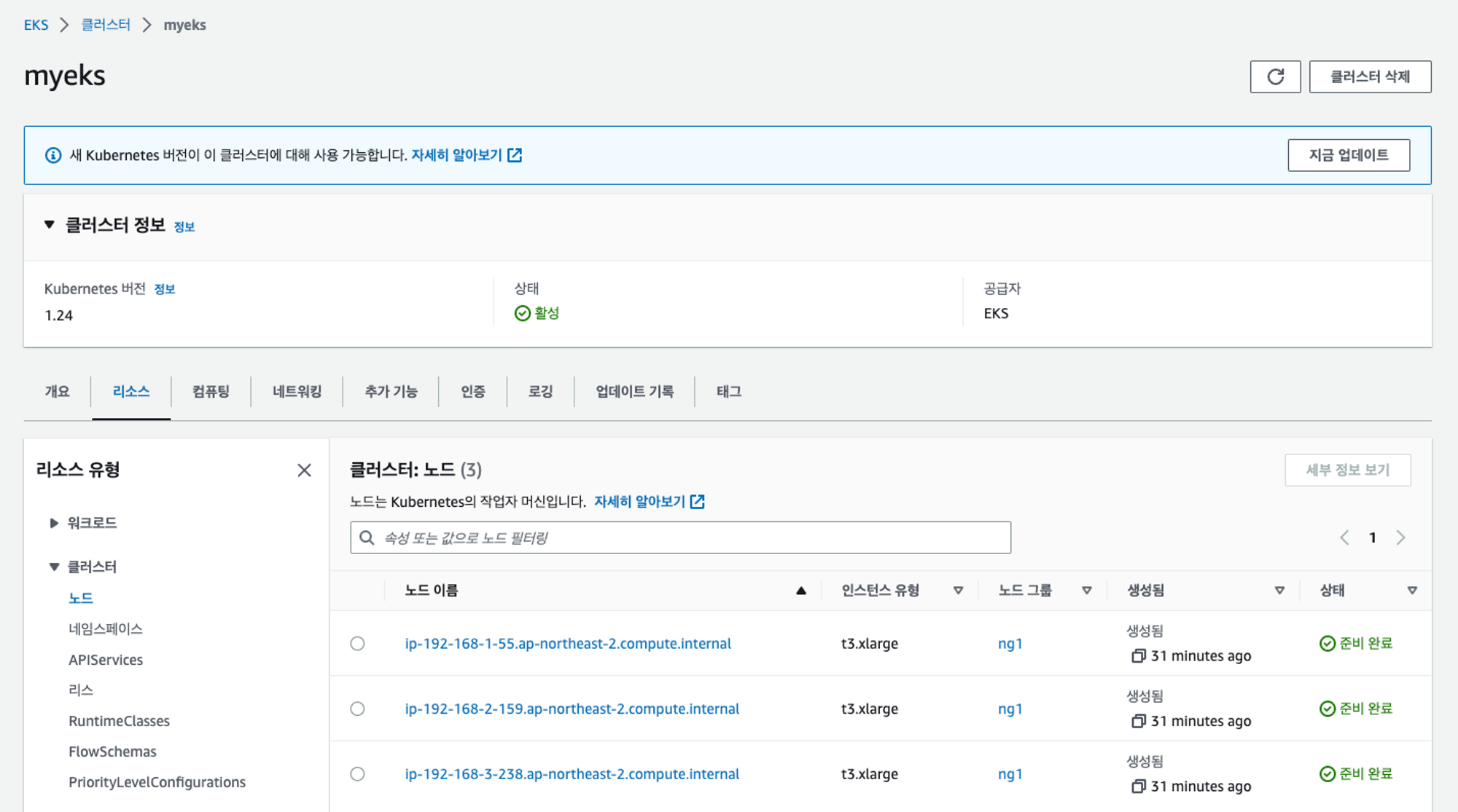 EKS > 클러스터 > myeks(스터디를 통해 생성한 클러스터) >리소스 탭을 보면 워크로드, 클러스터 등의 전체 리소스를 확인할 수 있다.