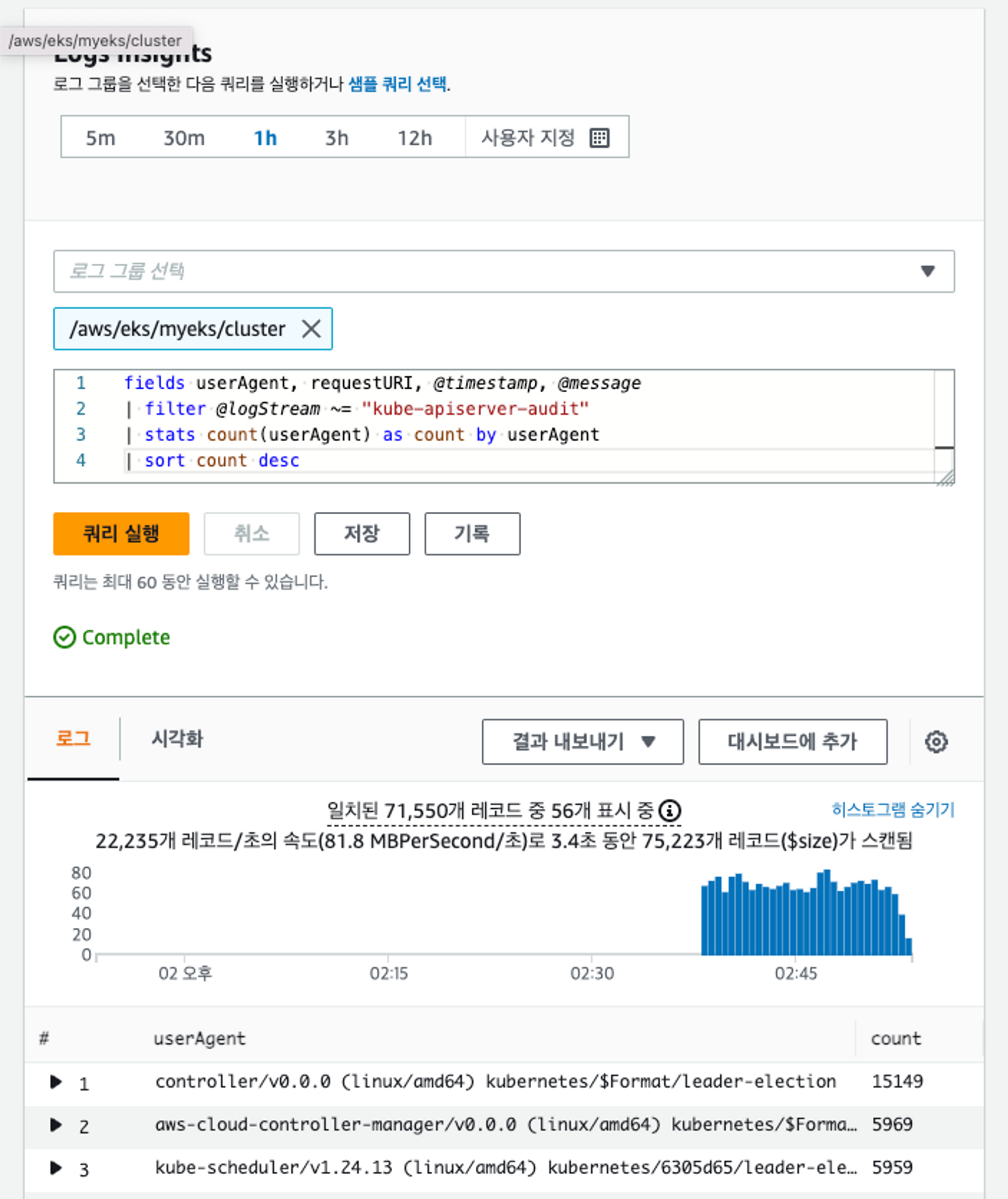 /aws/eks/myeks/cluster라는 로그 그룹이 생기고, 로그 스트림 안에 5가지의 로그들이 생성된다. 잠시 기다리면 로그 그룹이 생성된다.