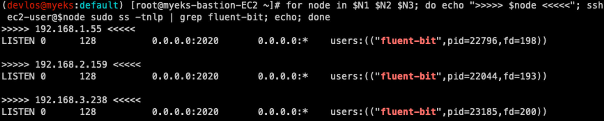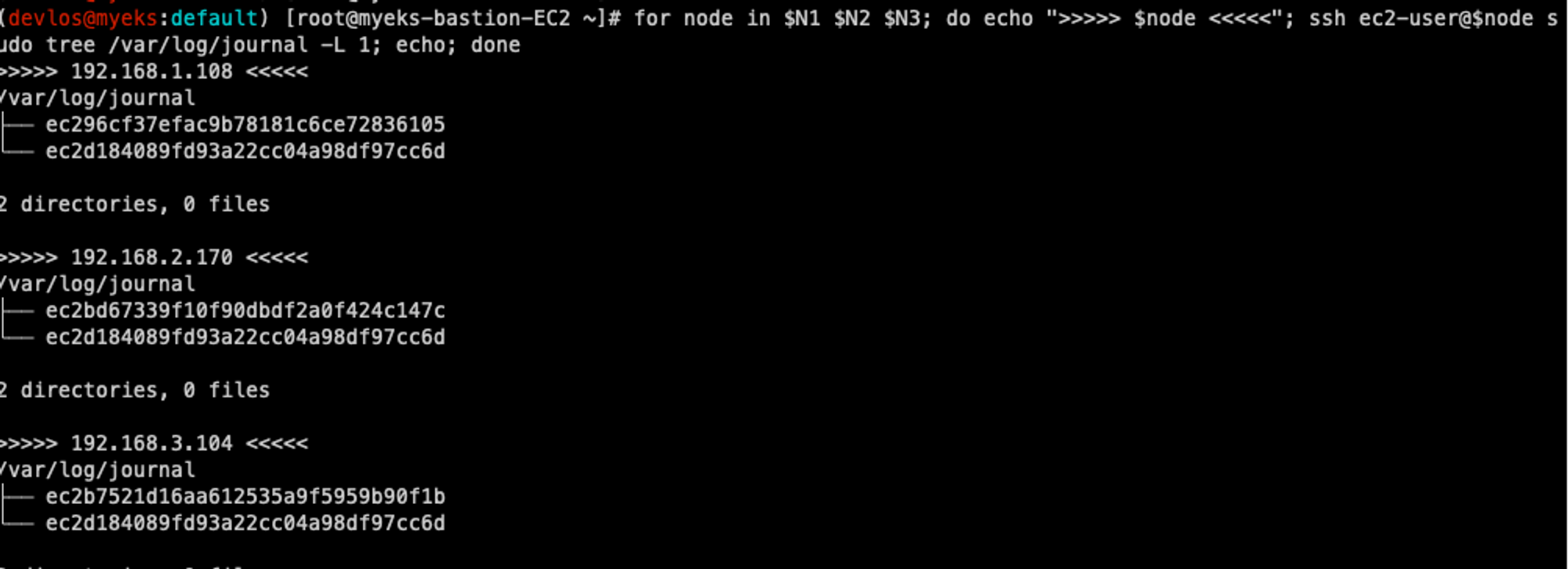 for node in $N1 $N2 $N3; do echo ">>>>> $node <<<<<"; ssh ec2-user@$node sudo tree /var/log/ -L 1; echo; done